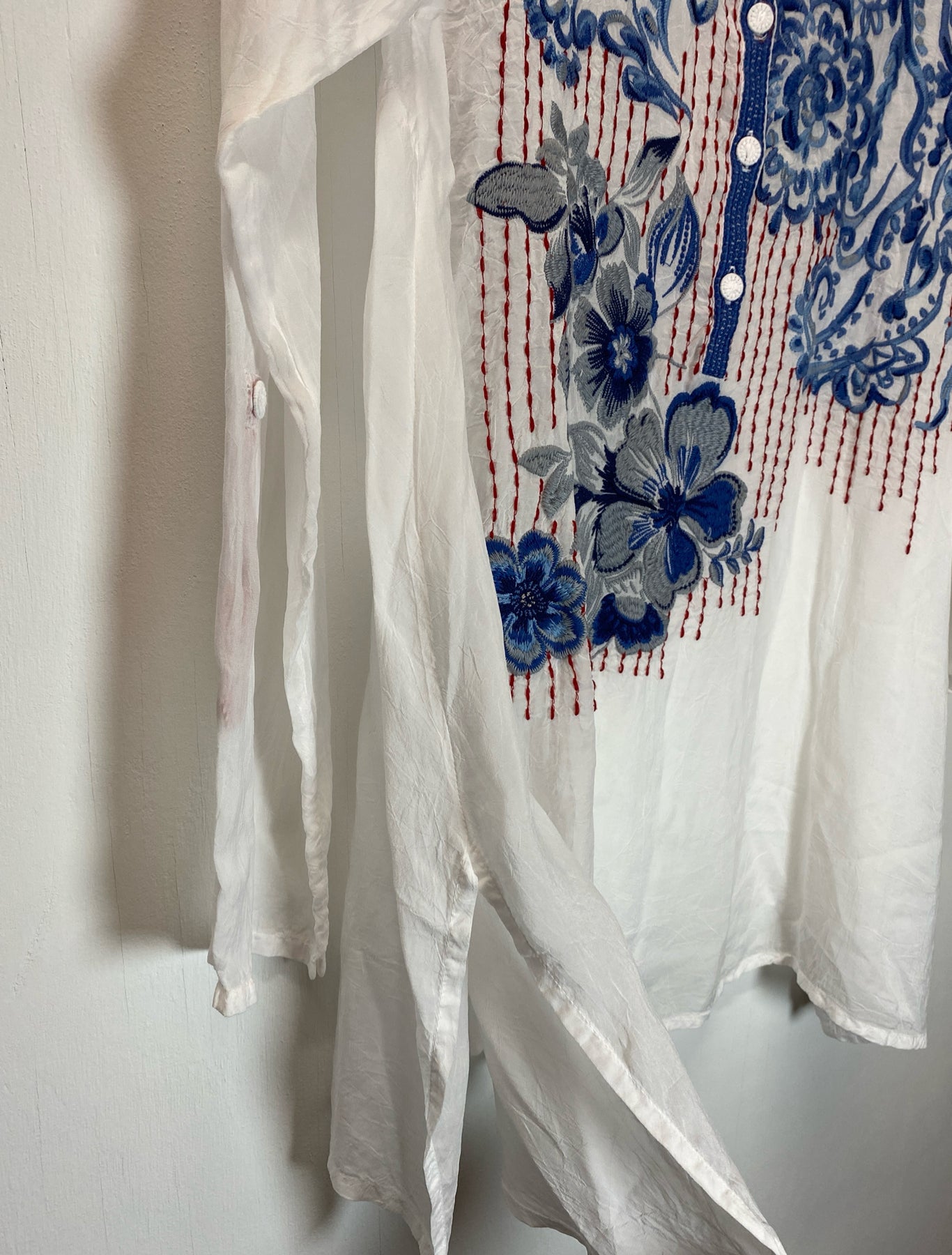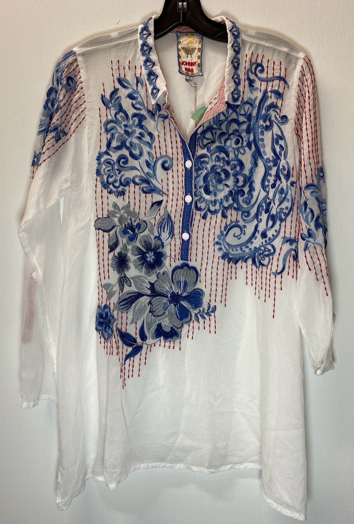 Johnny Was sheer silk tunic red and blue embroidered